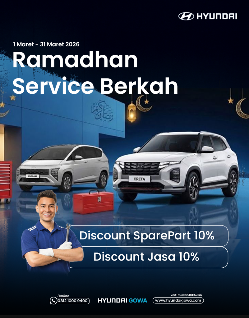Persiapan mudik kini lebih hemat bersama Hyundai Gowa. Nikmati program “Ramadhan Service Berkah” dengan diskon 10% untuk sparepart dan jasa servis selama Maret 2026 (S&K berlaku).